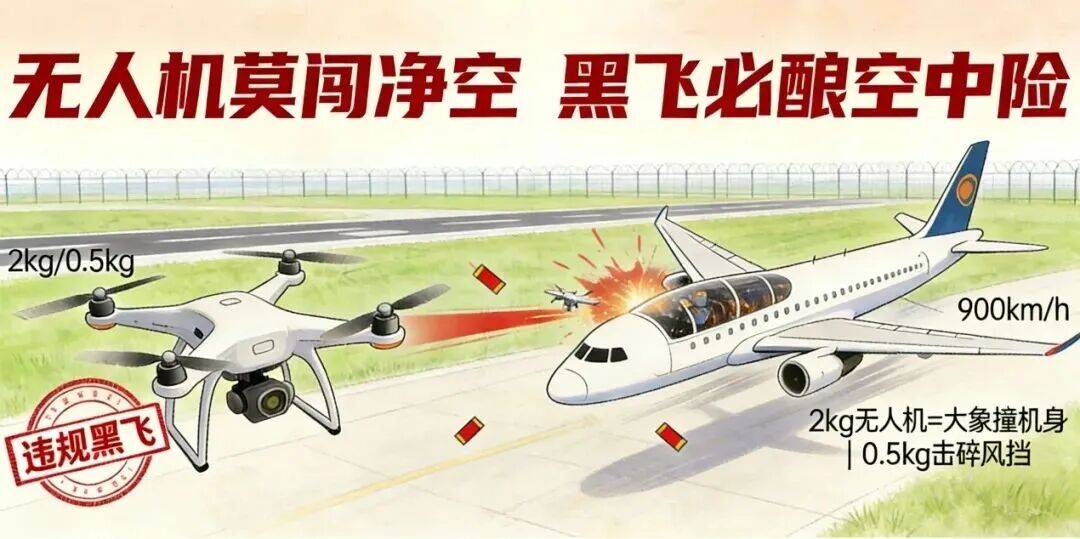无人机是近年来航空安全的最大隐患之一。无人机与高速飞行的飞机相撞,破坏力惊人。请严格遵守 “机场净空区禁飞、远离机场放飞” 的原则,切勿 “黑飞”。