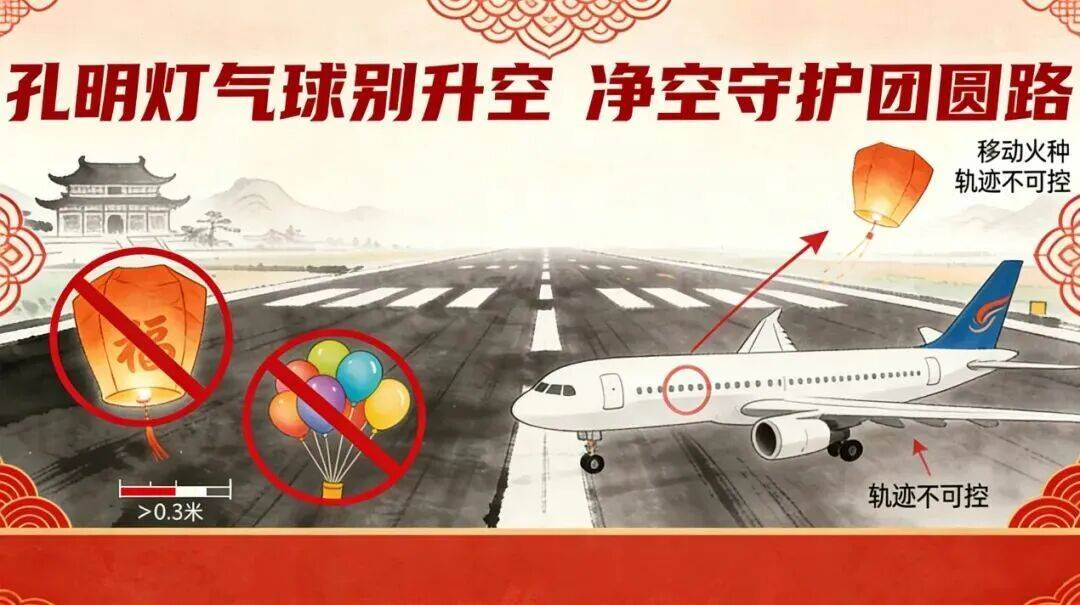 孔明灯被称为 “移动的火种”,其飞行轨迹完全不可控,一旦飘入机场,极易挂在飞机起落架或天线处。而气球,尤其是直径超过0.3米的大型气球,同样会对飞行造成严重干扰。